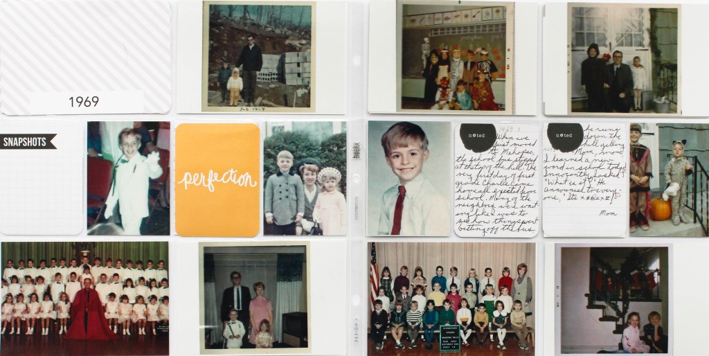 A surprise 50th birthday party was the motivation to make a “50 for 50″ album. Rather than a photo book, a physical scrapbook was assembled. Photos from the birthday boy’s parents were digitized for his boyhood photos and digital photos were printed out for the more current images. Cards were distributed to the family members to write down memories, and one two-page spread was created for every year, with plenty of blank cards included to continue to record memories. The finished book is 12″ x 12”. A companion smaller book featuring photos and words documenting the surprise party can be found HERE